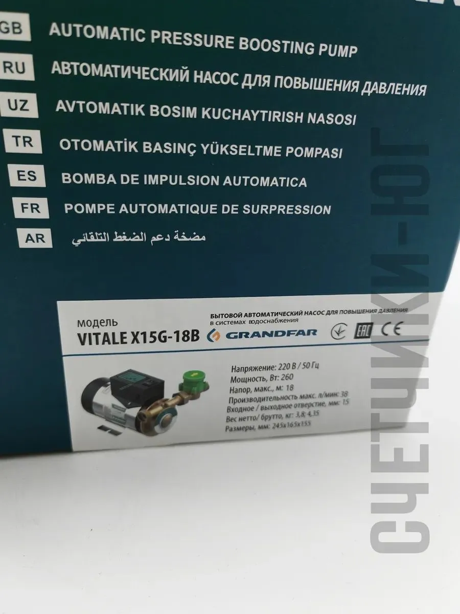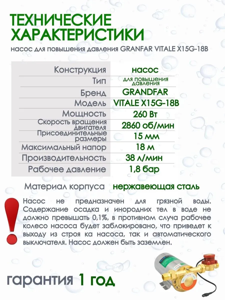 Бытовой автоматический насос для повышения давления в системах водоснабжения Grandfar Vitale X15G-18В. Данный насос для решения проблемы связанной с недостаточным уровнем давления воды. Кроме того, могут быть использованы для повышения давления в системах водоснабжения использующих солнечный нагреватель, охлаждение промышленного оборудования, системах насыщения кислородом воды для рыболовных прудов и аквариумов.