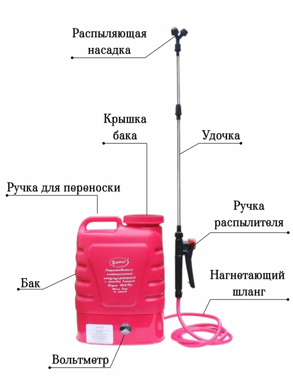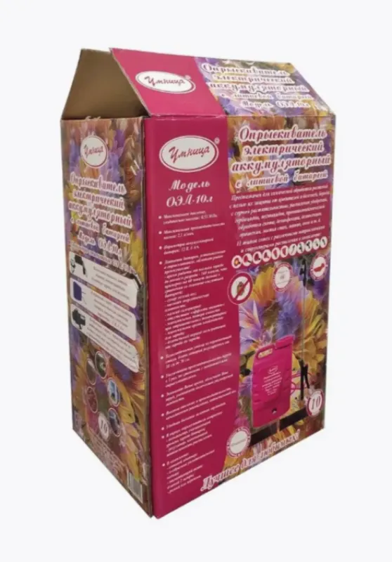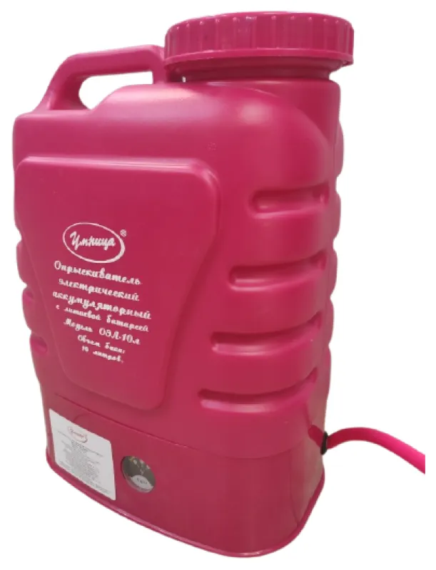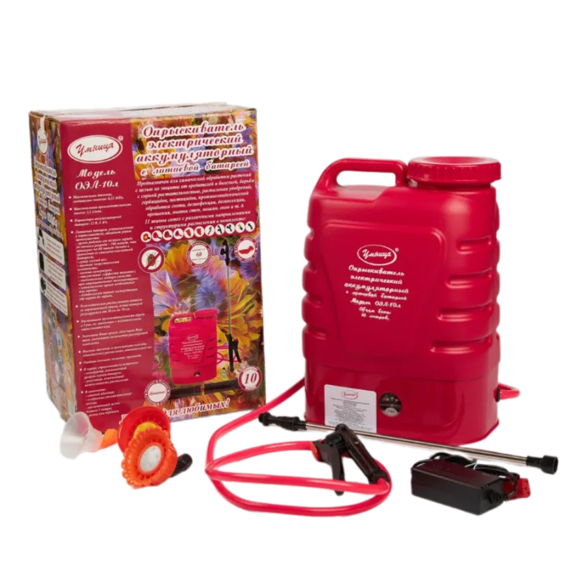 Автоматический аккумуляторный опрыскиватель с насадками для фермерских, парковых, садовых хозяйств или для домашнего пользования в огороде. Садовый распылитель Умница ОЭЛ-10 предназначен для химической защиты растений от вредителей (от жуков, от насекомых) и болезней, борьбы с сорной растительностью (сорняками), распыления воды для увлажнения и полива деревьев, растений и цветов, удобрений, гербицидов, пестицидов, противоэпидемической обработки скота и т.д. Также они могут использоваться для дезинфекции, дезинсекции, мытья окон, стен, машин.