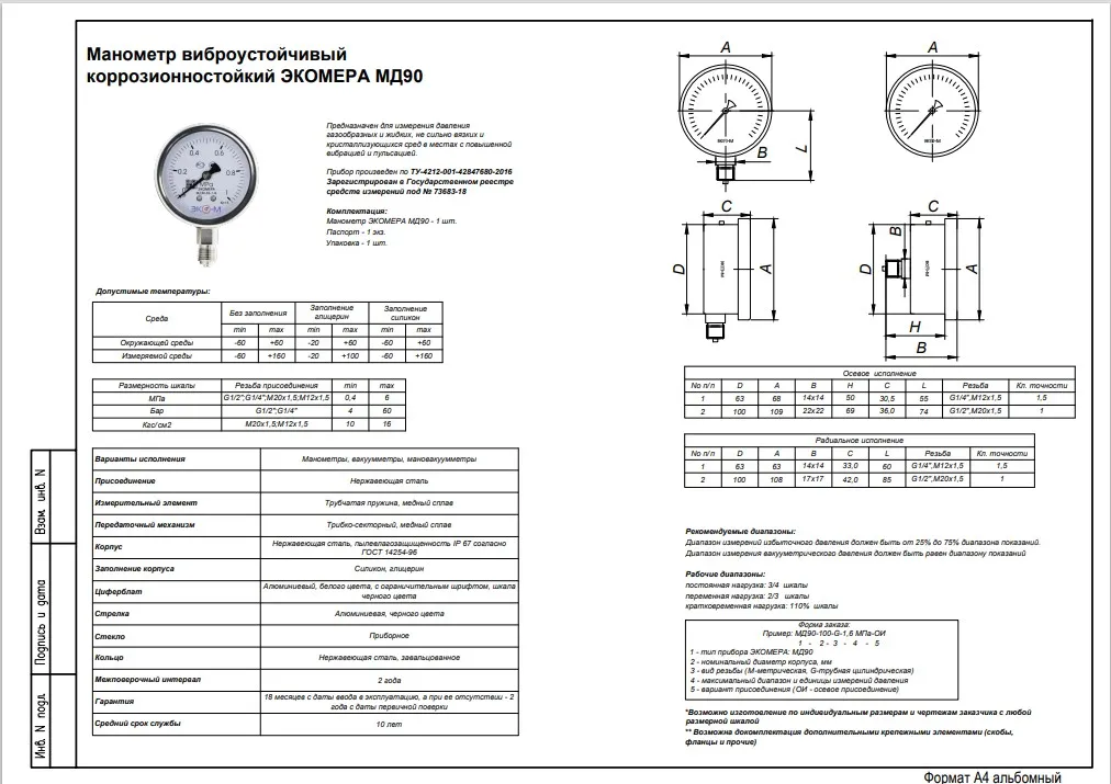Манометр виброустойчивый коррозионностойкий ЭКОМЕРА МД90