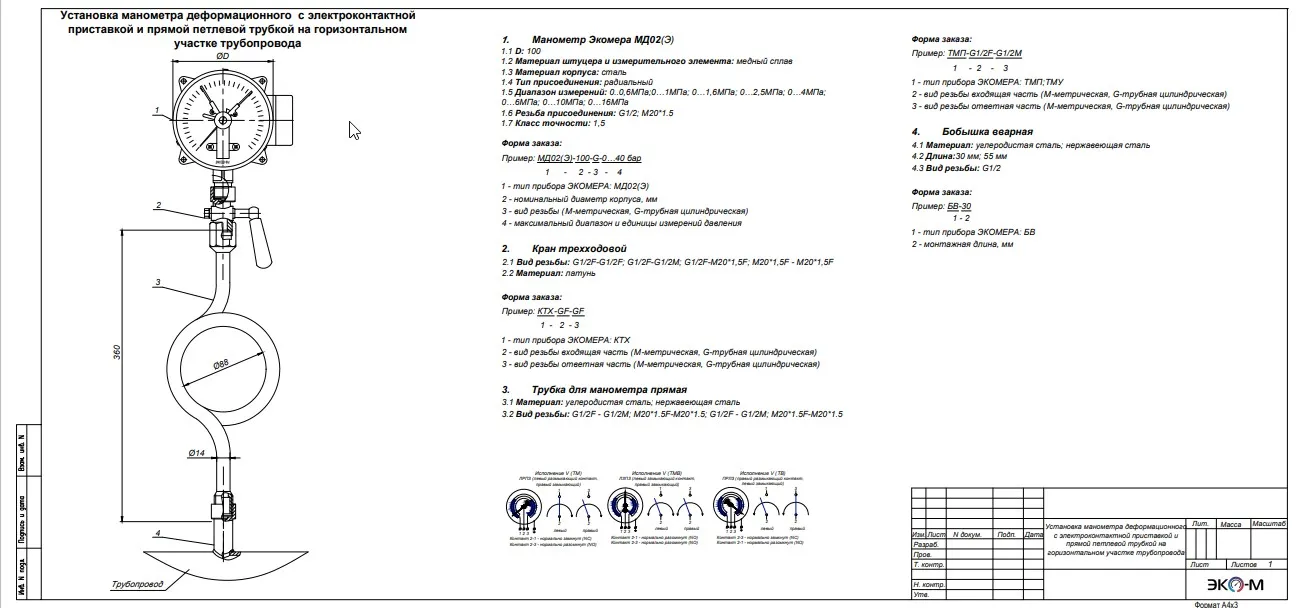 Типовая схема установки манометра с электроконтактной приставкой (исп.V) и прямой петлевой трубкой на горизонтальном участке трубопровода с бобышкой с внутренней резьбой